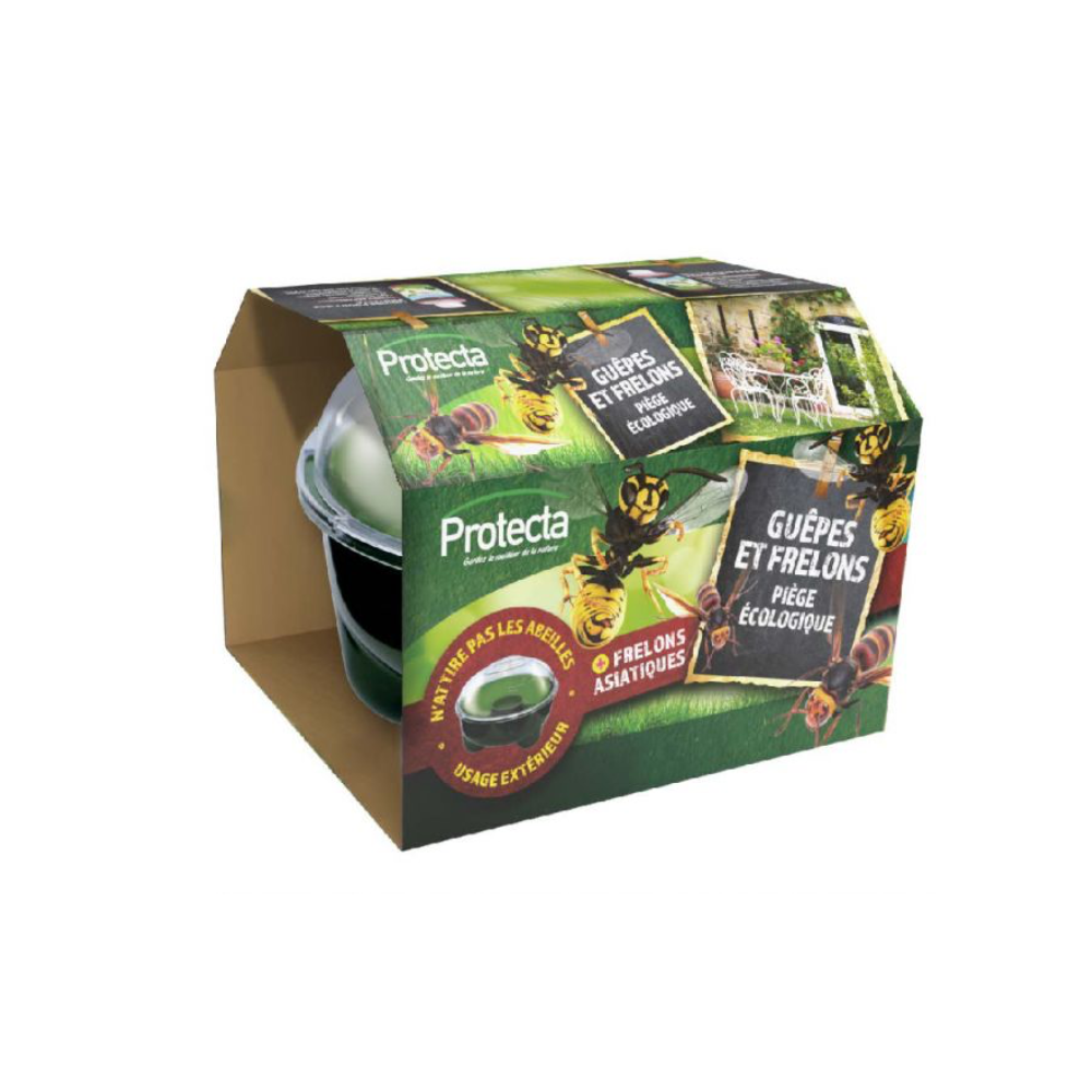 Piège écologique d'une contenance de 2,4L à suspendre ou à poser à l'extérieur en vue de l'élimination des guêpes, frelons asiatiques, et mouches.