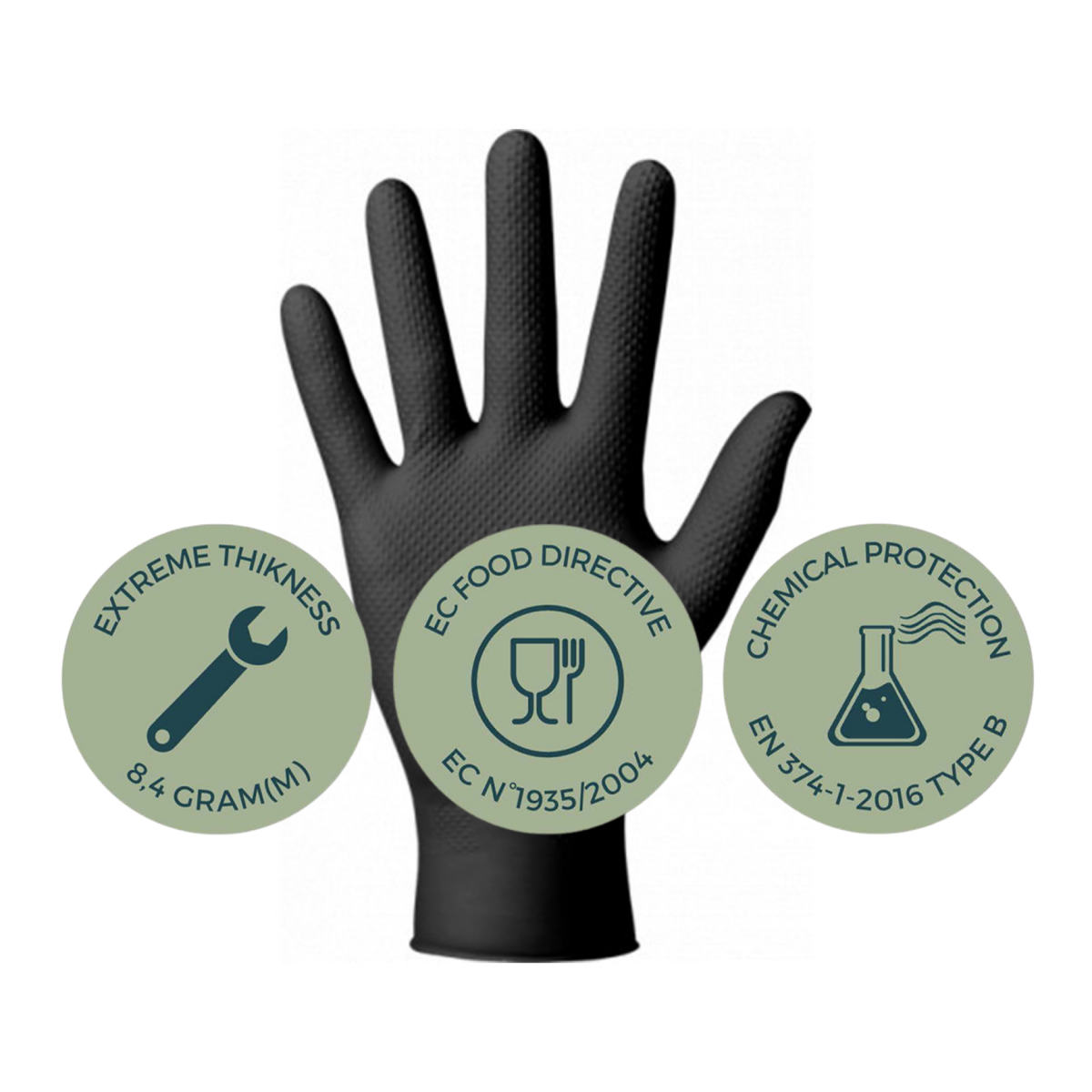 Matière : 100 % caoutchouc nitrile butadiène (NBR) Sans poudre Sans latex : parfaitement adaptés aux personnes allergiques Qualité alimentaire : compatibles avec les aliments gras et alcoolisés jusqu’à 10° Étanchéité élevée, très bonne stabilité Très bonne grippe grâce à une texture optimisée Difficiles à déchirer, adaptés aux manipulations exigeantes AQL 1.5 (EN 455‑1) Durée de conservation : 5 ans après fabrication Catégorie EPI : CAT IIIPoids : 9g en taille L, 9.8g en taille XL