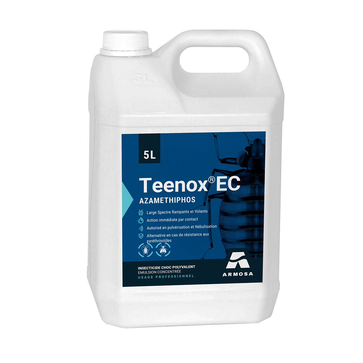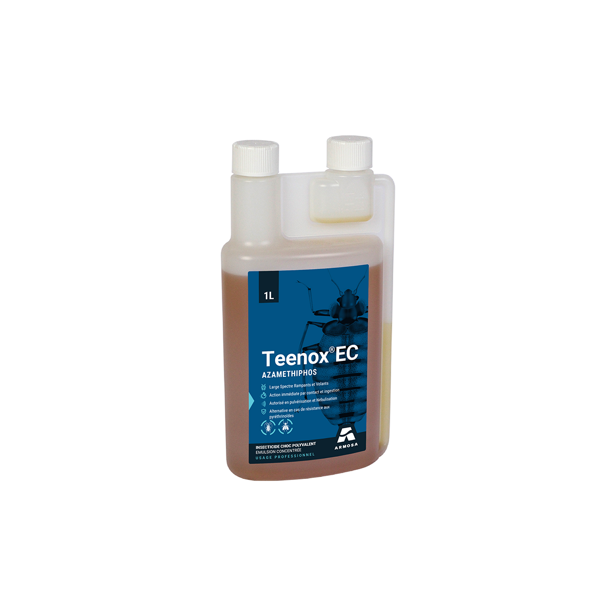TEENOX EC est un concentré insecticide émulsionnable utilisable en pulvérisation ou en nébulisation, à base d’Azaméthiphos, pour le traitement choc contre les insectes rampants et volants, tels que les punaises de lit, blattes, fourmis, mouches, moustiques et guêpes.